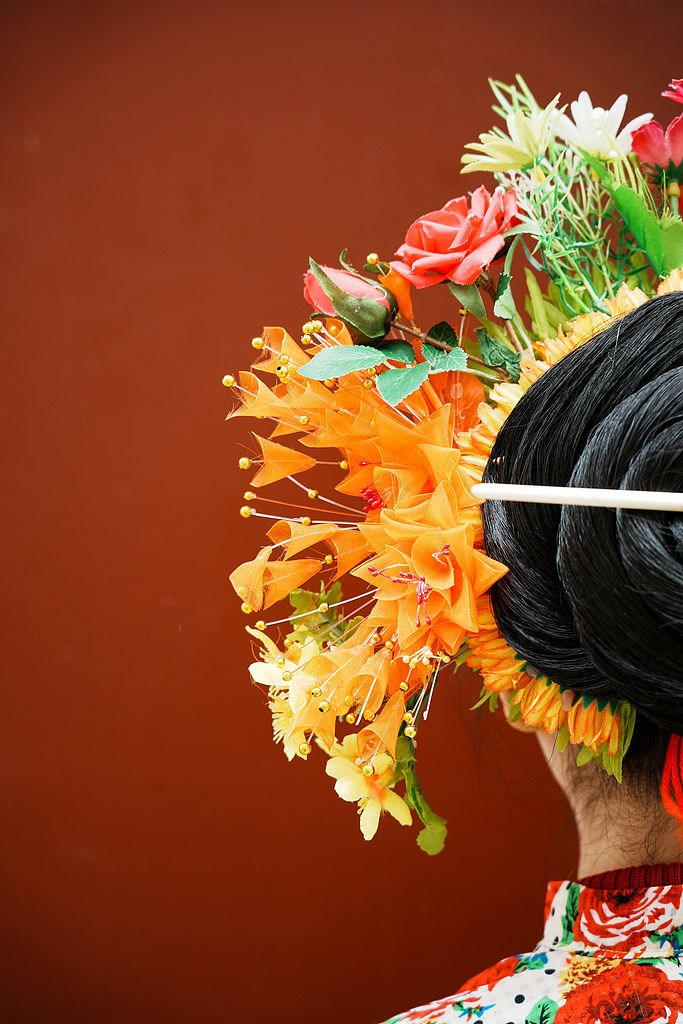 鲜艳的花朵热烈盛开于发髻之间